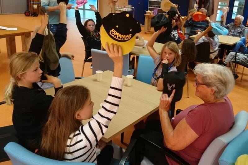 Op Prinsjesdag kwam groep 6 van de Hannie Schaftschool bij de deelnemers en vrijwilligers van de Locomotief op bezoek. Traditiegetrouw werd het spel ‘hoedje op, hoedje af’, een Prinsjesdag-variant op het spel ‘petje op, petje af’, gespeeld. Heel leuk én leerzaam voor zowel de basisschoolkinderen als de ouderen. Natuurlijk was er tussendoor voldoende tijd om met elkaar in gesprek te gaan. De ouderen en de jongeren hadden elkaar veel te vertellen!